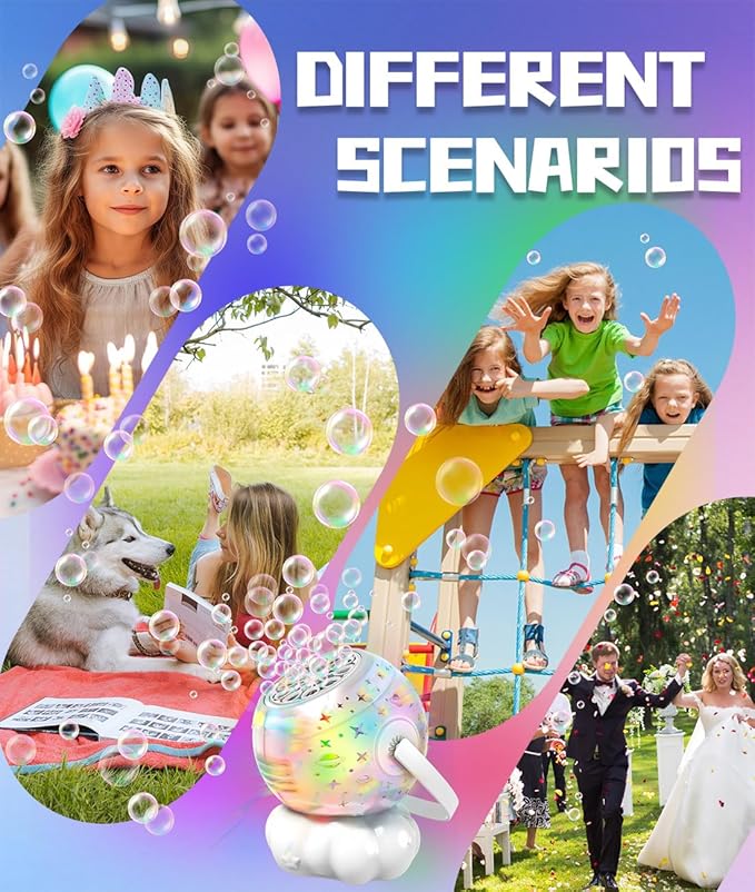 • Magical Starry Light Show: Multicolor LEDs project starry patterns through precision-cut holes, creating a dreamy bubble atmosphere. Watch kids’ eyes light up as they chase glowing bubbles and explore imaginative space-themed play