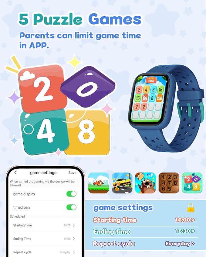 • [Puzzle Games & Parental Controls]: Equipped with 5 built-in puzzle games to boost reaction and calculation skills, this smartwatch also includes parental controls. Use the app to restrict game access during school hours or lock games entirely, ensuring a balanced experience.