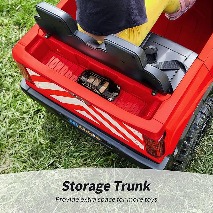 • 19" DUAL SEATER : This battery powered police kids car has ample seater, allowing two children to ride together comfortably under 110lbs. Adjustable seat belts and double-locking door design also ensure kid's safety.