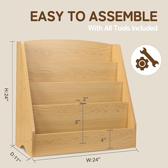 • 【STIMULATES CURIOSITY】- At 24" x 11" x 24" (L x W x H), this book shelf has a right height for children, allowing them to easily view and pick up their favorite books. Books can be displayed by front cover instead of the spine, making it easier for kids to choose books, fueling their love for reading.🪄📚