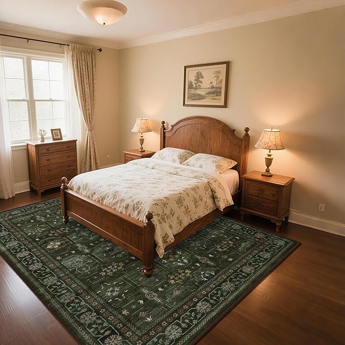 4x6 Area Rug for Bedroom Machine Washable, Non Slip Vintage Floral Kitchen Rugs for Dining Room, Low Pile Indoor Floor Print Carpet for Nursery Farmhouse Home Office Dark Green