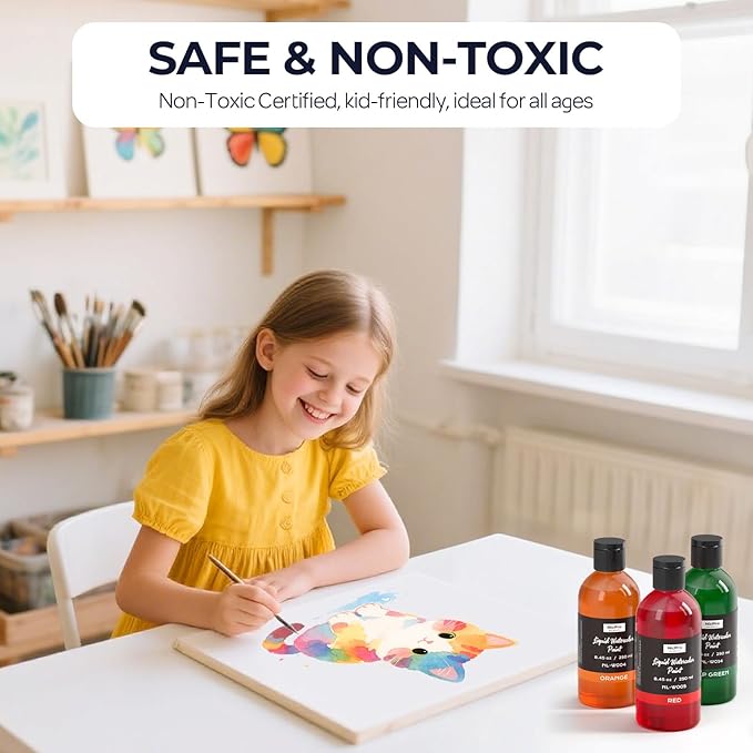 • STRONG PIGMENTS – NON-WASHABLE: These liquid watercolors feature ultra-rich, highly concentrated pigments that deliver vivid, intense color. However, they are not washable—they may permanently stain hands, clothes, and surfaces. Please use protective gloves and cover your workspace to ensure mess-free creativity