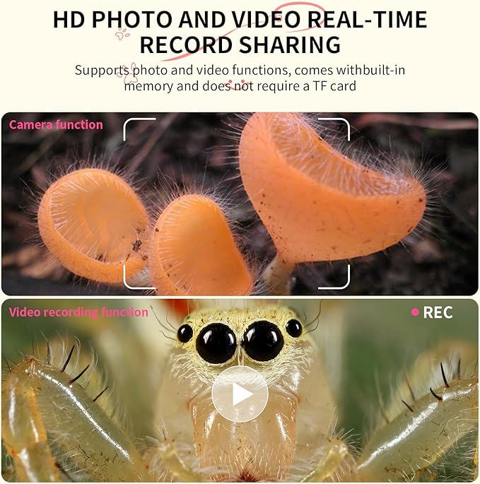 • Multifunctional Kids Microscope The Ashfly mini microscope supports photo taking and video recording, and comes with a memory of 100 photos (does not include TF card). The digital microscope also comes with a USB cable that can be used to charge the microscope and safely transfer photos and videos to a computer