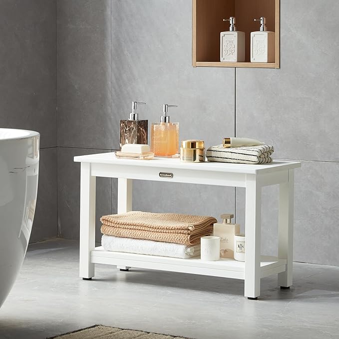 • 【Plus size & Adjustable Feet】Larger size: 30*13 inches, which can bear more load (Weight capacity is about 700LBS), double-layer super large space, Water Resistant & Non-fade:The shower seat has strong water resistance, can be safely washed with water, and is made of 100% polystyrene material, without using any paint, so it will never fade. It adds 4 adjustable rubber feets which can protect your floor to scratch.