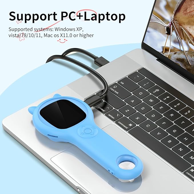 • Dual Lens Microscope The 2 inch digital microscope is convenient to capture the wonderful moments and record the little surprises of observation, and the other side of the physical magnifying glass makes it easy to view the small objects around you at any time. Note: DO NOT point the illuminated lens at your eyes