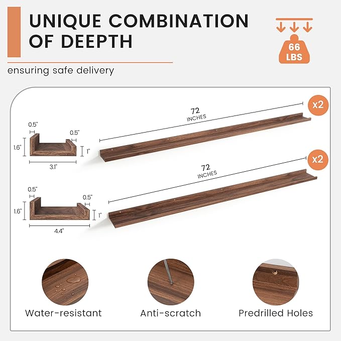 • 【Picture Ledge Perfect for Display】FLYJOE picture ledge shelves for wall turn your walls into a stunning photo gallery! These spacious shelves are ideal for showcasing a variety of picture frames in one secure place. With a thoughtful protective lip, you can display everything from photos to collectibles without worrying about them falling off