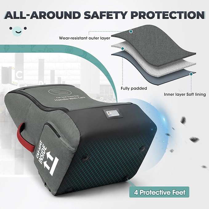 • Safety Protection Design: This car seat travel bag features thick, padded inner side wings and inner fixing straps that securely hold the infant car seat in place, ensuring optimal protection for convertible car seats. Dual lockable zipper opening improves safety. Moreover, with 4 thick feet on the bottom, the padded car seat travel bag provides complete scratch protection.