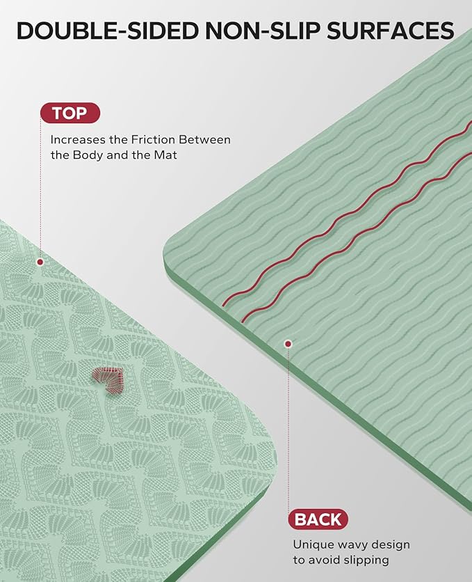 • sided non-slip surface to keep you stable and secure during your practice without worrying about slipping or sliding. The unique wave pattern on the bottom enhances grip on a variety of surfaces, ensuring your mat stays securely in place even during the most challenging yoga poses. (Not for use on carpet)