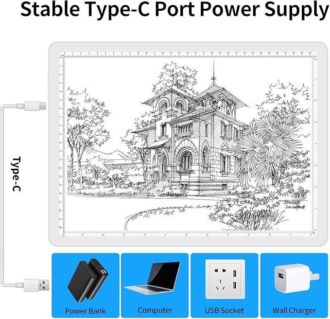 • 【 Standard A4 size, CM-INCH double scale 】 This super bright lightpad Overall Size is 35.2 x25.4 x 0.9 cm ( 13.9 x 10.0 x 0.35 inches ), and the visual working area is 31.6 x 21.8 cm ( 12.5 x 8.6 inches ). Illuminated area large enough for international standard A4 paper. This Light Drawing Sketch Pad has a dual scale of centimeters and inches to meet your various usage habits.