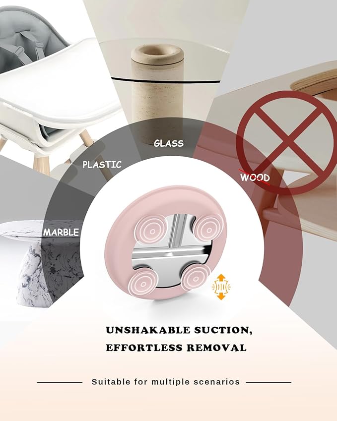 • Innovative Design: This baby plate with suction combines durable 304 stainless steel with a silicone suction base featuring 4 strong, non-slip suction cups. Keeps plates in place on highchair trays or tables, helping your child self-feed and minimizing mealtime mess. Say goodbye to flipped toddler plates and hello to free hands for mom!
