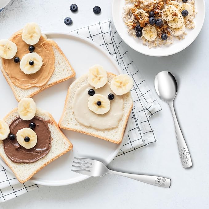 • PERFECT FOR KIDS LITTLE HANDS: Easy for the kiddos to handle and not too heavy to use. Easy for kids to hold and learn with. These silverware are so fun with cute cartoon pattern, helps with learning to eat. Sharp enough to poke the food without hurting them. This silverware is so pretty and the perfect size for kids!