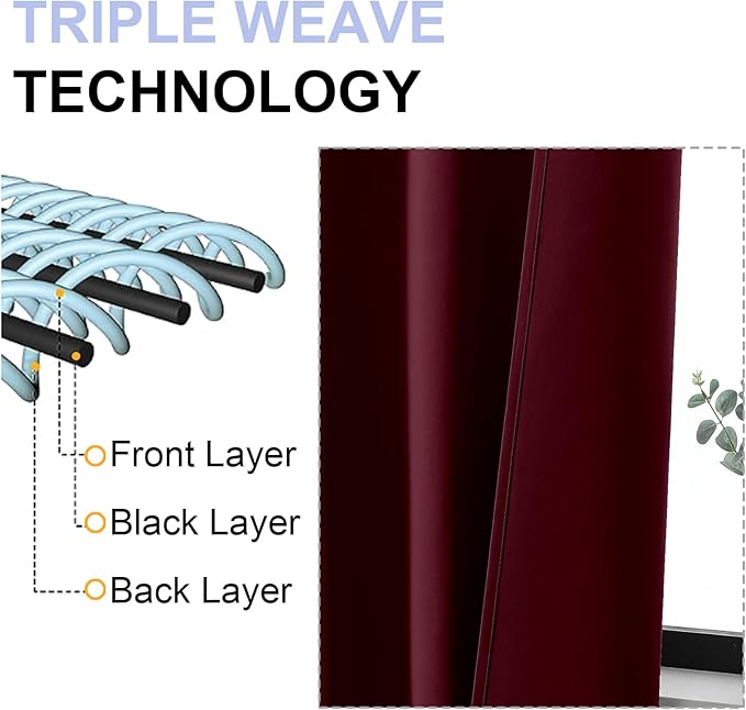 • High-Quality Materials: Crafted from high-quality polyester fiber, guarantee both stiffness and drape. This soft yet durable light-blocking fabric boasts a three-layer weave, with a middle layer of black yarn acting as an effective light-blocking panel, effectively blocking light while providing privacy. The identical colors on both sides further enhance its aesthetic appeal, adding a touch of elegance to your home