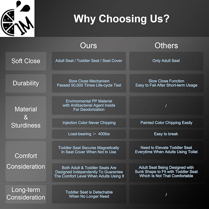 • NONO MORE SLAMMING - Both the Adult and Toddler Seats, as well as the Seat Cover contained with our unique Silence-Closing Technology, no worry about pinched fingers or scaring the kids. MORE SLAMMING - Both the Adult and Toddler Seats, as well as the Seat Cover contained with our unique Silence-Closing Technology, no worry about pinched fingers or scaring the kids.