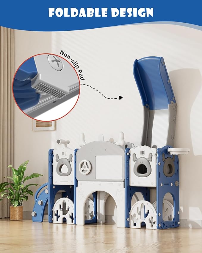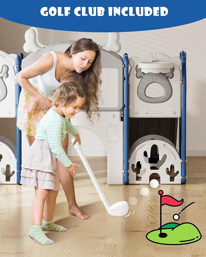 • 13-in-1 Toddler Playground: Toddler slide with 13 activity areas, New Play Golf Set, also includes slide, golf clubs and balls, drawing board, platform, Steering Wheel, Crawl-through Tunnel, corridor, basketball hoop, Elk Antlers, binoculars and 2 storage spaces for toys!