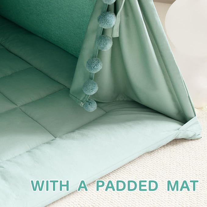 Teepee Tent for Kids with Padded Mat Cotton Canvas Kids Tent with Pompom for Toddlers Indoor Play Tent for Girls Boys with Stars Lights, Carry Bag, Banner Flag (Green)