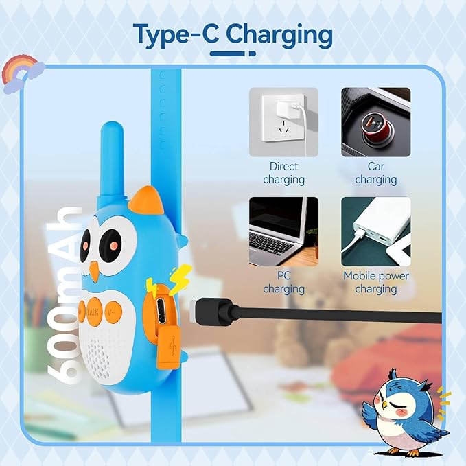• Stay connected; powered by a 600mAh battery, these walkie-talkies keep kids connected for up to 20 hours on a single charge. Quick Type-C charging means less waiting and more playtime