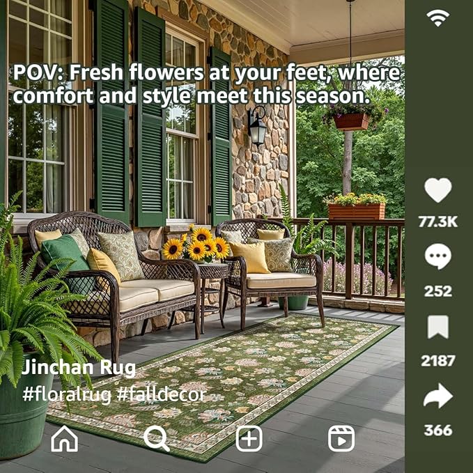 jinchan 3x8 Floral Runner Rug for Hallway Washable Kitchen Runner Vintage Romance Design Non Slip Thin Indoor Floor Cover Low-Profile Throw Carpet for Entryway Bathroom Bedroom Porch, Green