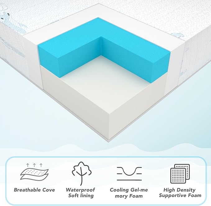 • Premium Memory Foam Crib Mattress – Made with high-density foam and cooling gel memory foam, this pack and play mattress topper supports your baby’s spine, head, back, and legs—promoting restful, comfortable sleep at every stage.