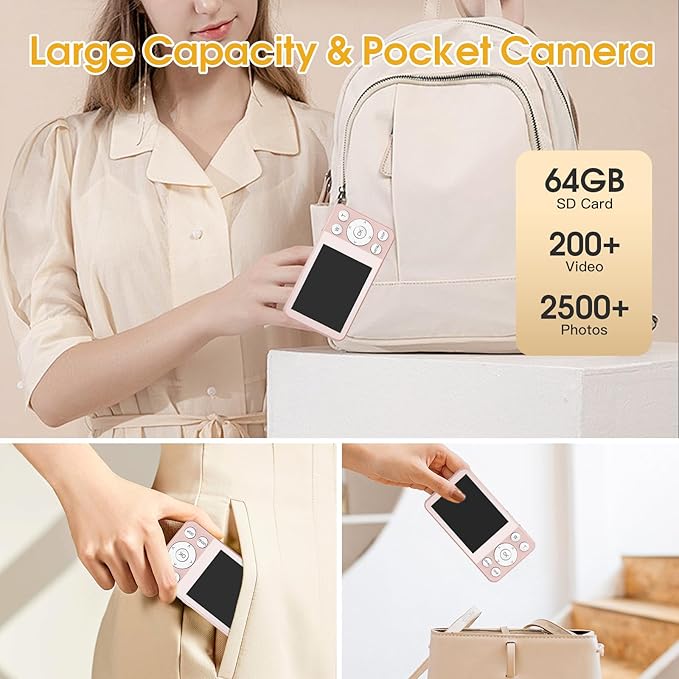 4K Digital Camera for Teens, FHD 64MP Digital Camera for Kids with 64GB SD Card, 18X Digital Zoom Cameras for Photography, Point and Shoot Video Camera for Kids, Pink