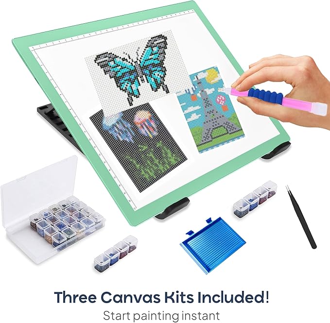 • Everything Included – Comes with 1 x EVA carry bag, 5 diamond painting pens (different types), 20 glue clay, 1 roller, 3 trays, tweezers, clips, fixing tool, reclosable bags, stickers, pen covers, and a sturdy stand—making it one of the most complete diamond painting light board sets on the market