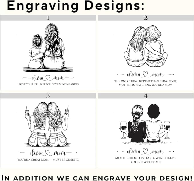 • Customizable: Our mother daughter keepsake box can be engraved with our available designs, including the daughter's name. The word "mom" can be adjusted to your preference—Momma, Mama, Mommy, Ma, Mum, Mother, Mimi, etc. The message "The only thing better..." can also be customized. Additionally, the inside of the lid can be engraved with your own message in various fonts we offer.