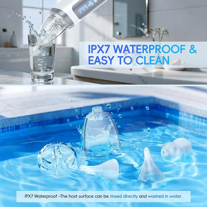 • SAFE & GENTLE – Pediatrician-Backed Design,Crafted with your baby's delicate nose in mind, our aspirator features a patented protection mode that automatically stops operation if the suction port is fully blocked. Equipped with 3 food-grade silicone tips, its soft, flexible material ensures a comfortable experience without irritation.