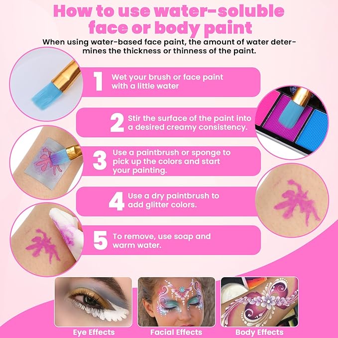 • 【Applicable For Multiple Parts】- It can be widely used on the face, hands and other parts of the body to create a comprehensive face and body painting experience for you. This water-soluble face paint is easy to use—just mix with water! Dilute for a thinner consistency to cover larger areas, or keep it thick for smaller, precise applications. Even if you’re not a professional face painter, you can quickly learn by following our instructions.