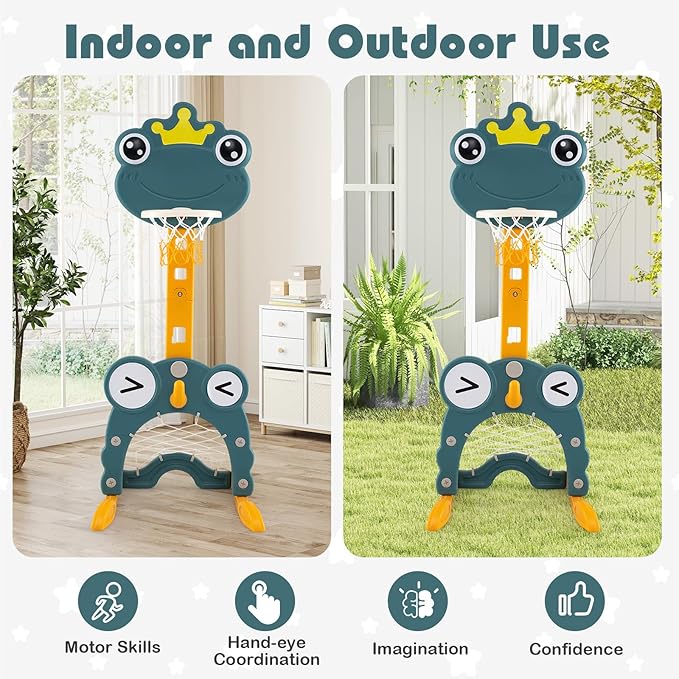 • Adorable yet Robust Design: The baby basketball hoop comes in adorable frog backboard, catering to children's interests. Crafted from high-quality HDPE material, the child basketball hoop is child-safe, wear-resistant and waterproof. Plus, it has reinforced nuts for added durability.