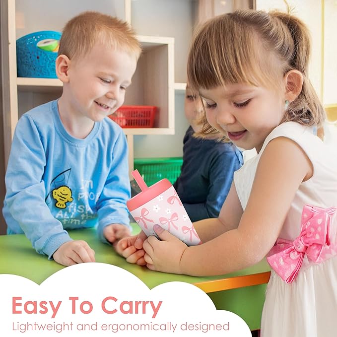 Kid Insulated Stainless Steel Tumbler with Silicone Straw, 12oz Sippy Cup for Kids (Pink Bows)