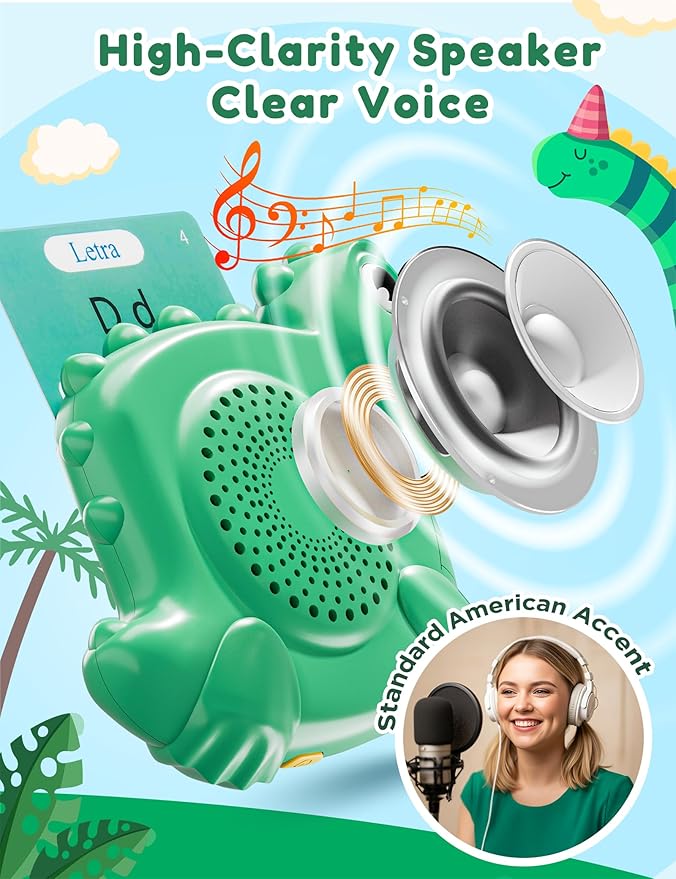 • Interactive Pocket Speech for Toddlers – Designed with a kid-friendly dinosaur shape & made of sturdy ABS material, this portable learning toy fits small hands. Clear American pronunciation & fun sound effects (animal/vehicle noises) enhance language recognition. Great for bilingual families!