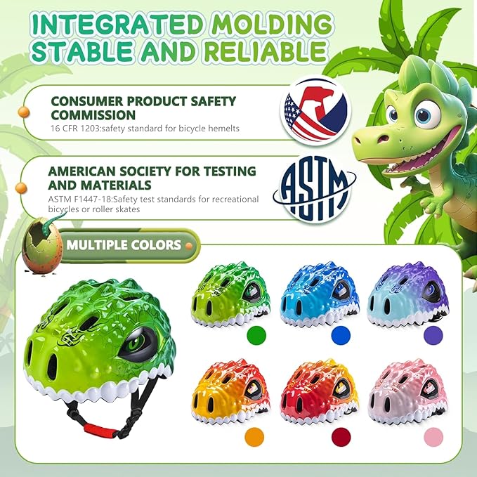 • 【7-IN-1 MULTIFUNCTIONAL PROTECTIVE GEAR SET】The toddler helmet set includes 1 3D Adjustable helmet, 2 knee pads, 2 elbow pads, 2 wrist pads, 1 bicycle bell, 1 helmet lining. The unique animal appearance of the helmet easily wins the love of children, and you no longer have to worry about your child not liking to wear a helmet.