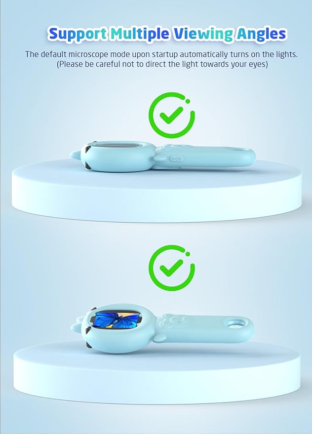 • Safe & Durable Portable Kids’ Microscope: This 2 Inch IPS kids' microscope is made of safe ABS material, and comes with a silicone protective case and a hanging rope, which is drop resistant and durable. it measures 6.77 * 2.87 * 0.55 inches and weighs 0.23 pounds, which can be held by hand, hung around the neck, or carried in a pocket, making it suitable for the child to use