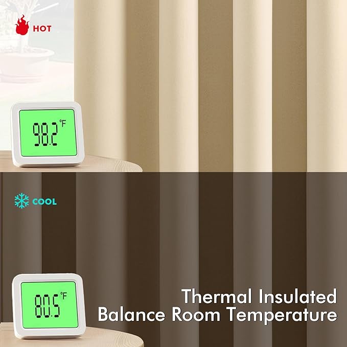 • High-Quality Material: Crafted from high-quality 225GSM polyester fabric, these curtains offer enhanced durability and elegant drape. The soft blackout material features triple-layer weaving technology, with a middle layer of black yarn for superior light blocking and privacy. Both sides feature the same refined color, ensuring a seamless look that elevates your home’s aesthetic with understated sophistication