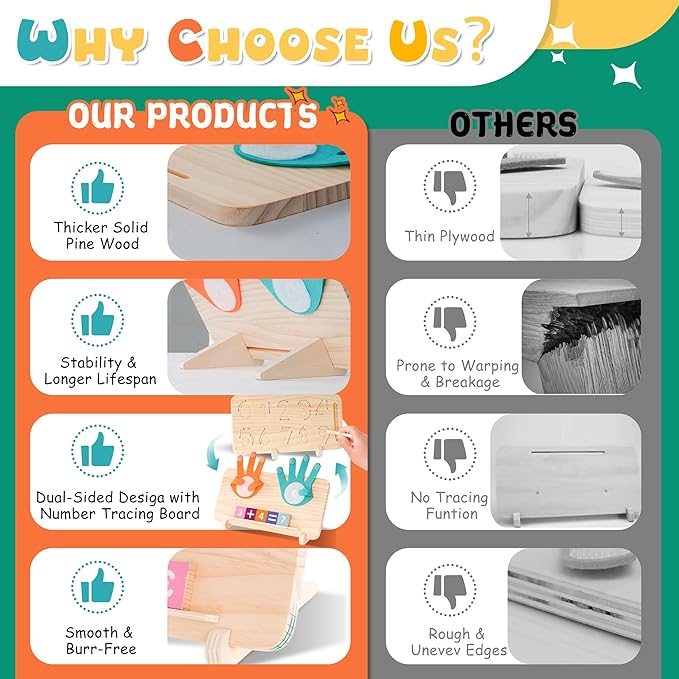 • DOUBLE-SIDED INTERACTIVE LEARNING: Designed for little hands, our toy simplifies addition and subtraction within 10. It helps kids build strong number recognition and counting skills. The back side includes a unique number tracing board with a wooden stylus, enabling kids to practice handwriting skills while learning math