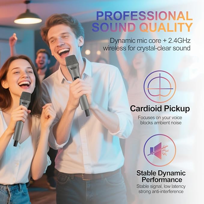 • 📡 ROCK-SOLID WIRELESS CONNECTION - Say goodbye to dropouts and interference! Our advanced 2.4GHz transmission ensures an incredibly stable and ultra-low latency connection. Enjoy seamless singing and speaking up to 100 feet away, giving you the freedom to move around the room, interact with the audience, and own the party without being tethered by cables.