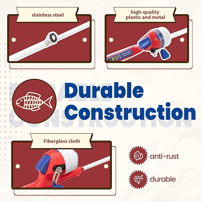 • Durable Construction: Our fishing rod's guide eyes use stainless steel instead of iron to make them less rusty. The fishing spin-cast reel with high-quality plastic and metal, which is more durable. The four-layer fiberglass cloth makes the fishing rod have better toughness and is not easy to break and rust, and it is also beneficial to the safety of children