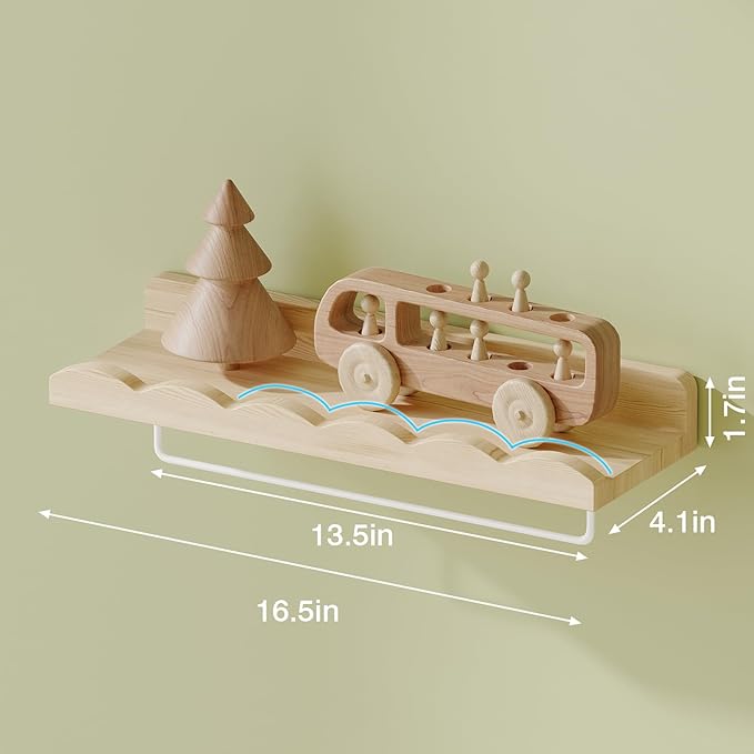 • 【Natural Wood & Anti-Crash Design】Our nursery shelves are Made of long-lasting solid pine wood, these floating book shelves are built to last and provide a reliable storage solution for your children's favorite items. With smooth edges and anti-crash design, this bookshelf not only organizes your child's books and toys but also adds a touch of safty and creativity to their space.