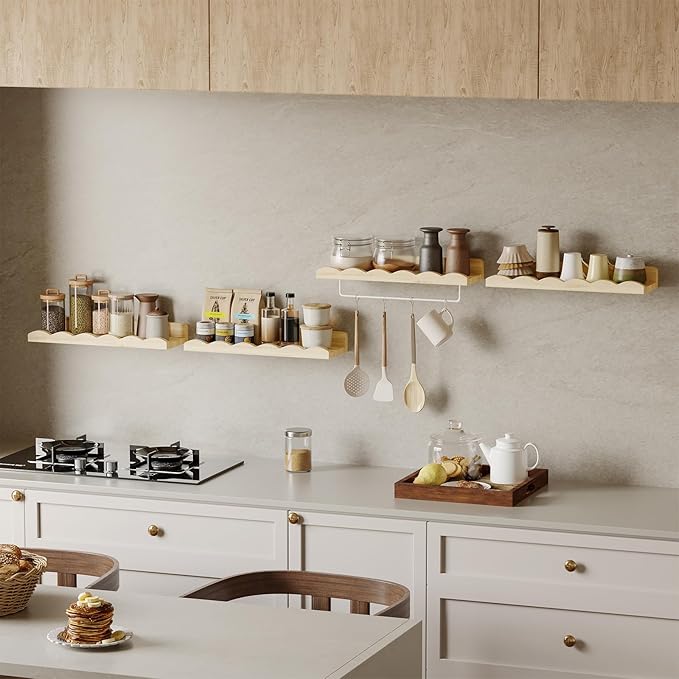 Fixwal Nursery Shelves, 16.5 Inch Floating Bookshelves for Wall Set of 4, Scalloped Wall Book Shelves with Towel Rack for Kids, Toddler Room, Baby Room, Nursery Decor and Storage(Natural Wood)
