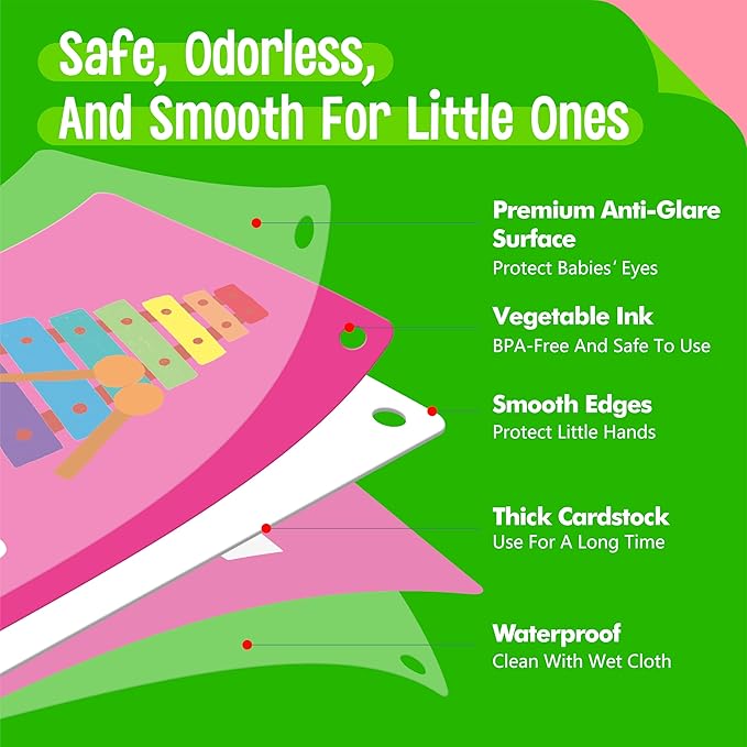 • Premium Quality: Made from thickened cardboard, durable enough for teething babies. Coated with premium anti-dazzle film, easy to recognize and protect babies’ eyes as well. Printed with non-toxic vegetable oil-based high gloss ink, BPA-free and safe to use. The rounded corners and smooth edges are safe enough for babies’ small hands to grab.