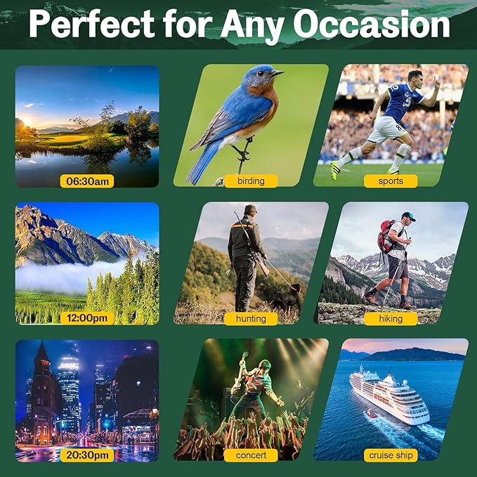 • 【HD Binoculars for Bird Watching & More】 This binocular is perfect for bird watching, watching concerts, sports events, and hiking. Whether you're on a camping, cruise, traveling, or catching an opera, these are your go-to travel companions. Its does not reflect army green shell is your discreet ally in bird watching, blending with nature.