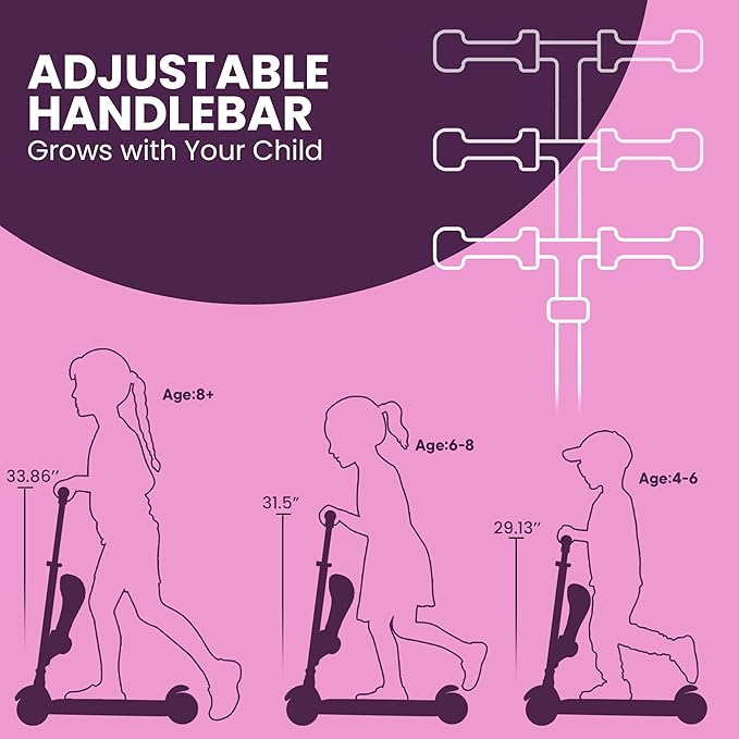 • Grows with Your Child – The adjustable T-bar handlebar offers four height settings (26.77’’, 29.13’’, 31.5’’, and 33.86’’ inches), making this kids 3 wheel scooter the perfect ride for toddlers as young as 2 years old weighing up to 165 lbs.