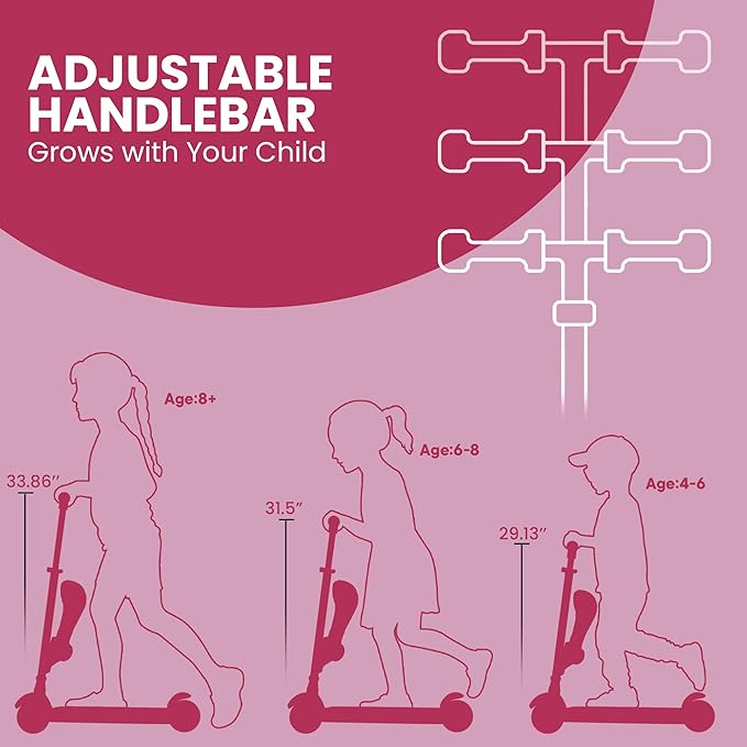 • Grows with Your Child – The adjustable T-bar handlebar offers four height settings (26.77’’, 29.13’’, 31.5’’, and 33.86’’ inches), making this kids 3 wheel scooter the perfect ride for toddlers as young as 2 years old weighing up to 165 lbs.