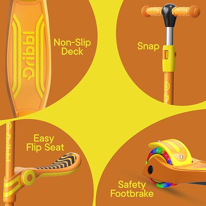Orange 3 Wheel Scooter with Seat for Kids – Light-Up LED Wheels, Adjustable Handlebar and Seat, Smooth PU Wheels, Wide Anti-Slip Deck, Rear Foot Brake – Toddler Outdoor Toys for Ages 2+