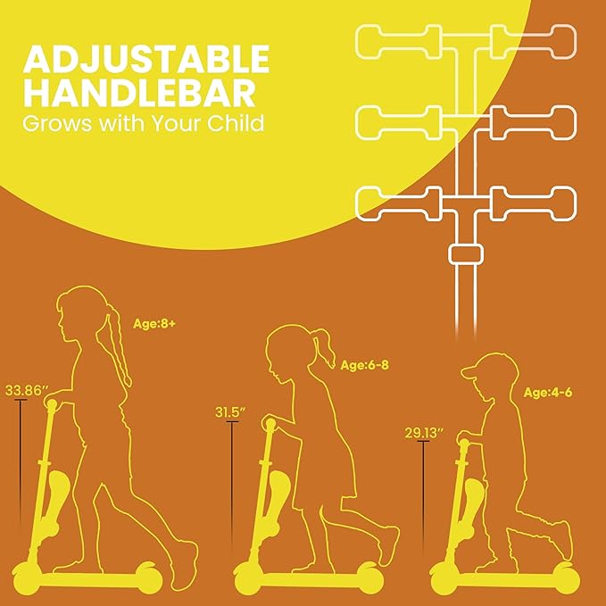 • Grows with Your Child – The adjustable T-bar handlebar offers four height settings (26.77’’, 29.13’’, 31.5’’, and 33.86’’ inches), making this kids 3 wheel scooter the perfect ride for toddlers as young as 2 years old weighing up to 165 lbs.
