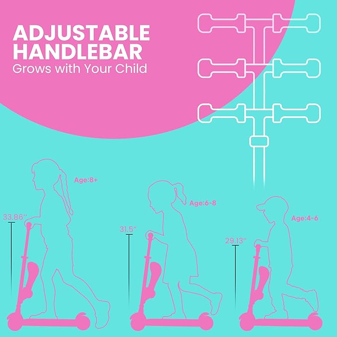 • Grows with Your Child – The adjustable T-bar handlebar offers four height settings (26.77’’, 29.13’’, 31.5’’, and 33.86’’ inches), making this kids 3 wheel scooter the perfect ride for toddlers as young as 2 years old weighing up to 165 lbs.