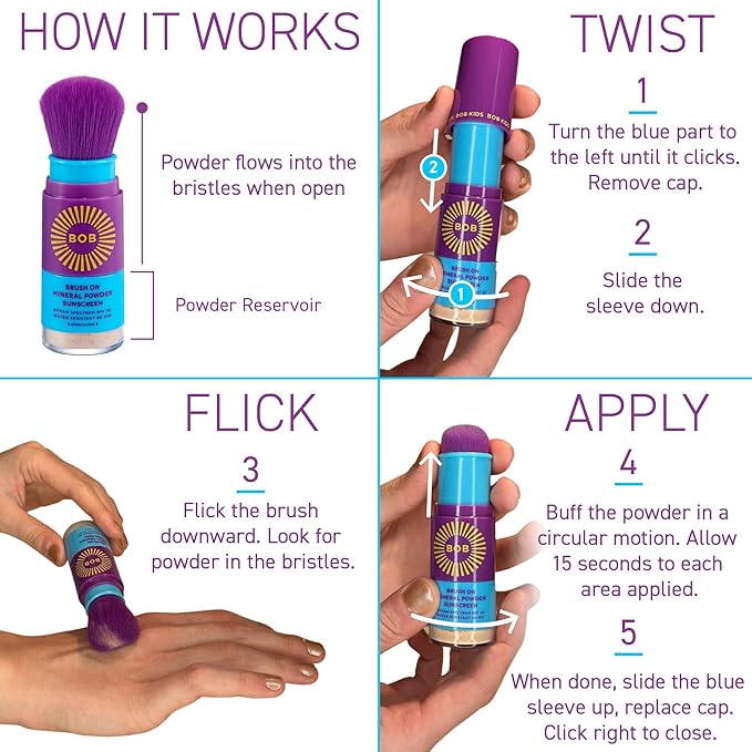 • No Fuss Application: BOB KIDS fluffy purple brush makes applying sunblock easy for both you & your child. To open, twist the bottom of the brush to the left & twist back to close; No mess, no tears