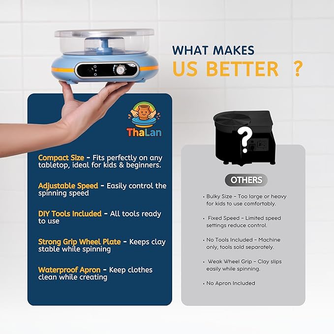 • ADJUSTABLE SPEED MOTOR WITH LOW NOISE OPERATION : Designed with adjustable speed settings, the ThaLan kids pottery wheel kit ensures smooth, quiet operation, allowing your child to focus on their creations without distraction. The precision control turntable spins evenly for trimming, shaping, and sculpting with professional results.