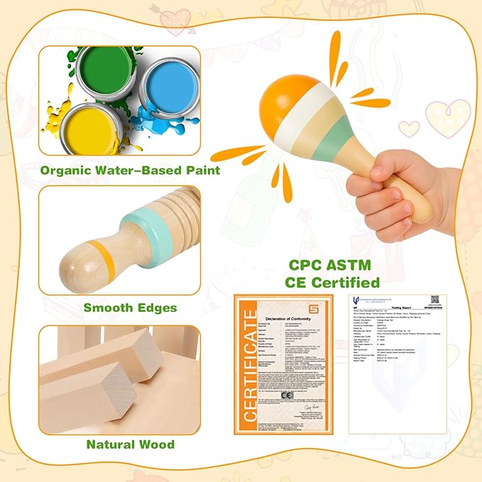 • 🌱 Child-Safe Montessori Toys for Toddlers 1-3- Our baby musical instruments are made from natural wood & non-toxic water-based paints. The montessori instruments for toddlers are CPC/ASTM certified. The montessori baby toys come with Smooth edges, no splinters, and baby-safe construction ensure worry-free play. Ideal toddler musical instruments for 1 2 3 Year Old, BPA-free and easy to clean.