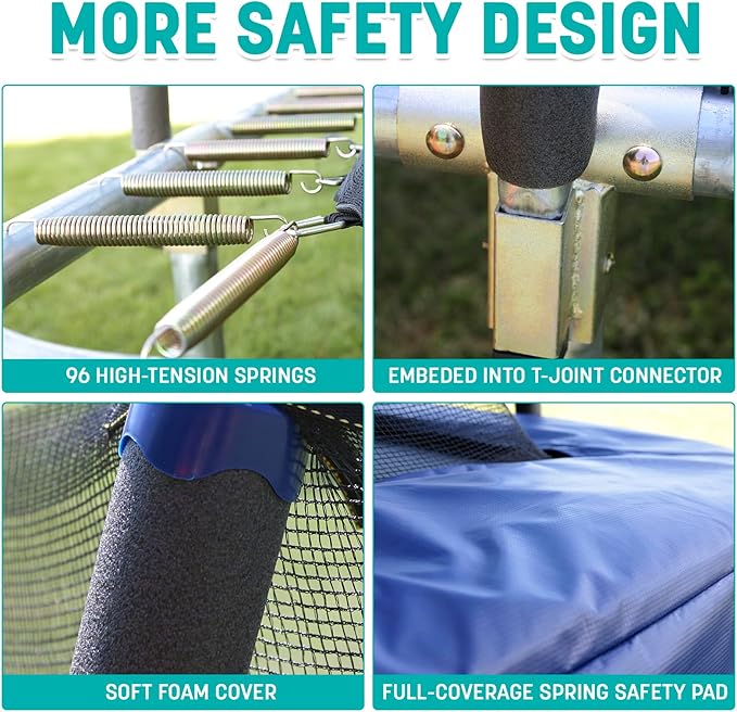 • ASTM Approved Safety – Meets or exceeds all ASTM standards, with a patented no-gap enclosure system and foam-padded poles that keep jumpers safe at all times.
