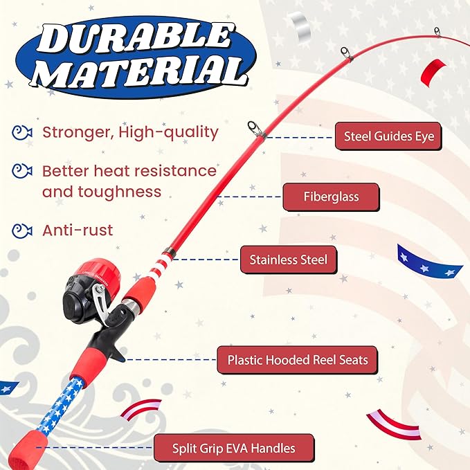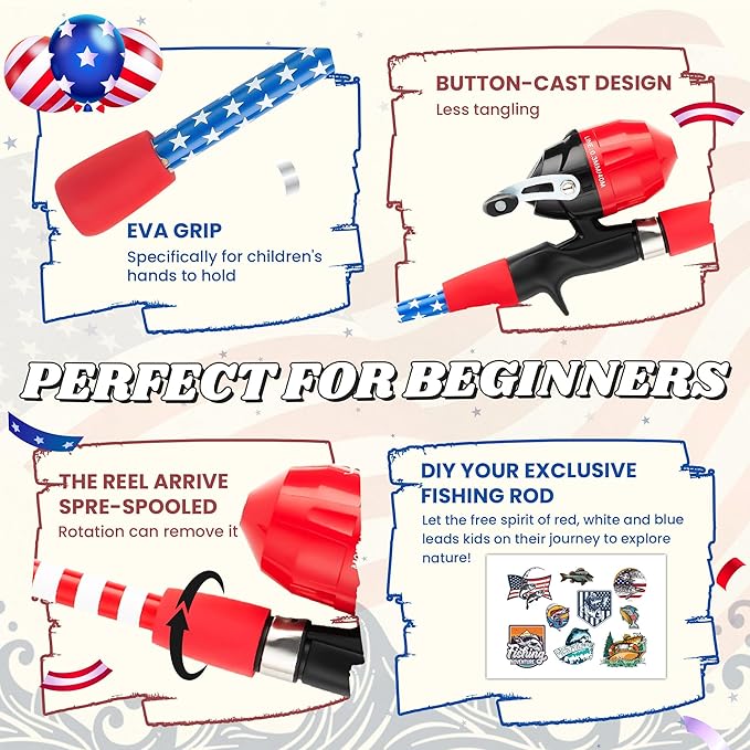 • BEST VALUE PATRIOTIC KIDS FISHING GEAR: Reel in freedom's spirit with every cast. Crafted with bold patriotic colors and iconic star-and-stripes detailing, our kids fishing pole is a mini tribute to American spirit. This Independence Day, don't just watch fireworks and parades. Take your children into nature and experience the joy of fishing!